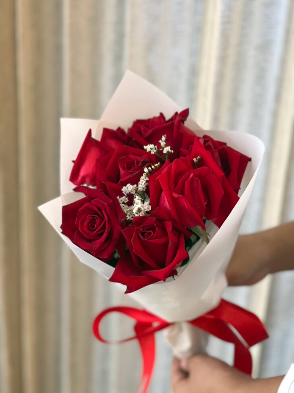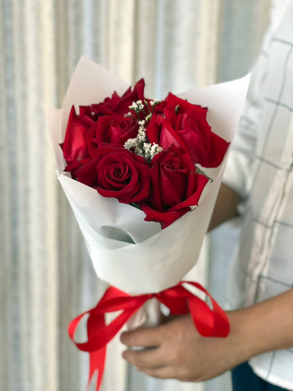 กุหลาบสีแดงสดสุดเย้ายวนใจ นำมาจัดช่อ ห่อด้วยกระดาษสีขาวและโบว์สีแดง พร้อมมอบให้แก่คนที่คุณรัก ดอกกุหลาบได้ชื่อว่าเป็นดอกไม้แห่งความรักแสนโรแมนติก และน่าค้นหาในเวลาเดียวกัน จะผ่านไปกี่ปีก็ยังเป็นดอกไม้สุดคลาสสิคที่ได้รับความนิยม